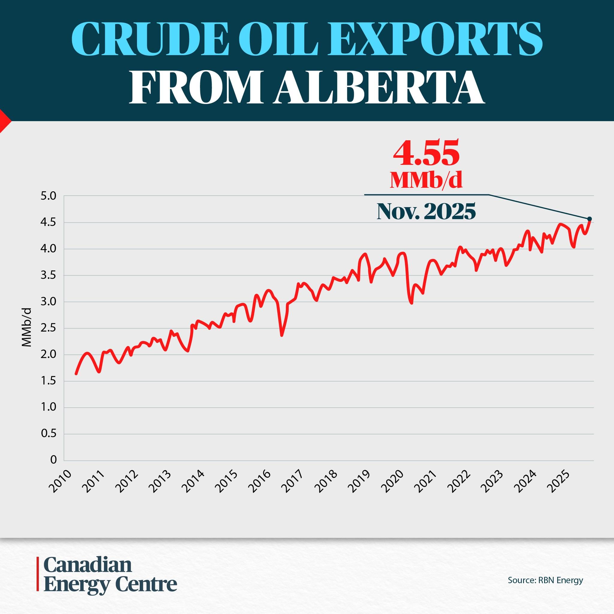 GRAPHIC: Crude oil exports from Alberta By CEC Staff on January 23, 2026, 2:37 pm MST Social Related Stories Emissions | February 13, 2026 New Alberta technology funding boosts methane reduction efforts Video | February 12, 2026 WATCH: Energy is key to Canadian prosperity Natural Gas | February 12, 2026 GRAPHIC: Alberta town chosen as home to Canada’s largest data centre
