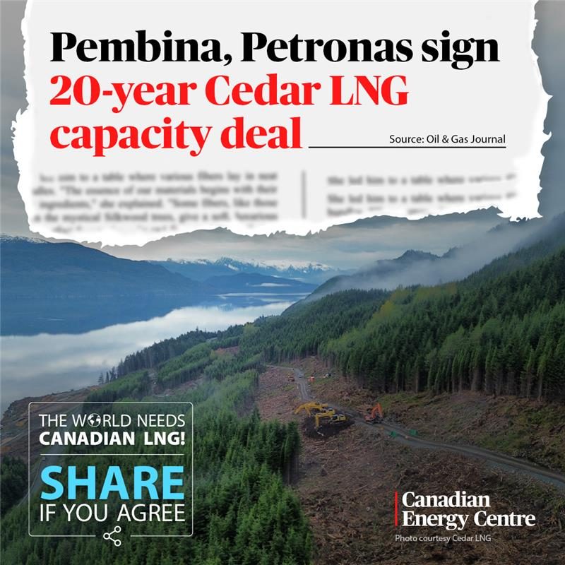 GRAPHIC: Pembina, Petronas sign 20-year Cedar LNG capacity deal By CEC Staff on November 21, 2025, 2:47 pm MST Social Related Stories Natural Gas and LNG | November 21, 2025 GRAPHIC: Pembina, Petronas sign 20-year Cedar LNG capacity deal Natural Gas and LNG | November 21, 2025 GRAPHIC: “Canada is a very interesting partner for us, not only because it’s very rich in LNG but also because it’s a very reliable partner with which we share a lot of values.” Natural Gas and LNG | November 21, 2025 GRAPHIC: B.C.’s natural gas production increased more than 37% since 2019